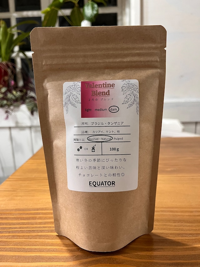 2月限定珈琲【バレンタインブレンド】 寒い冬の季節にぴったりな 程よい苦味と深い味わい。 チョコレートとの相性◎ 焙煎度:中深煎り 生産国:ブラジル/タンザニア 内容量:100g
