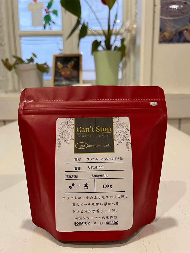 生産地:ブラジル・El Dorado農園 品種:カツアイ99 精製方法:アナエロビック 焙煎度:浅煎り 内容量:100 g クラフトコーラのようなスパイス感と トロピカルな余韻。